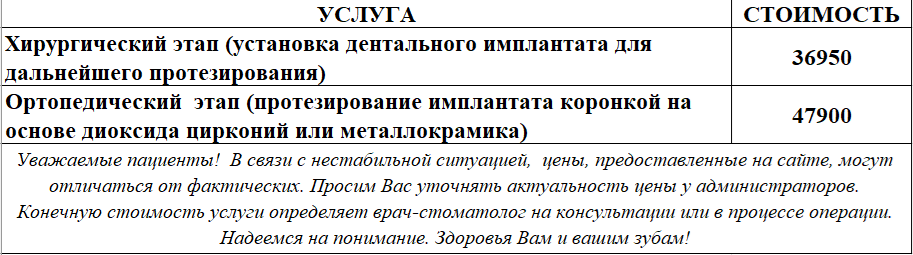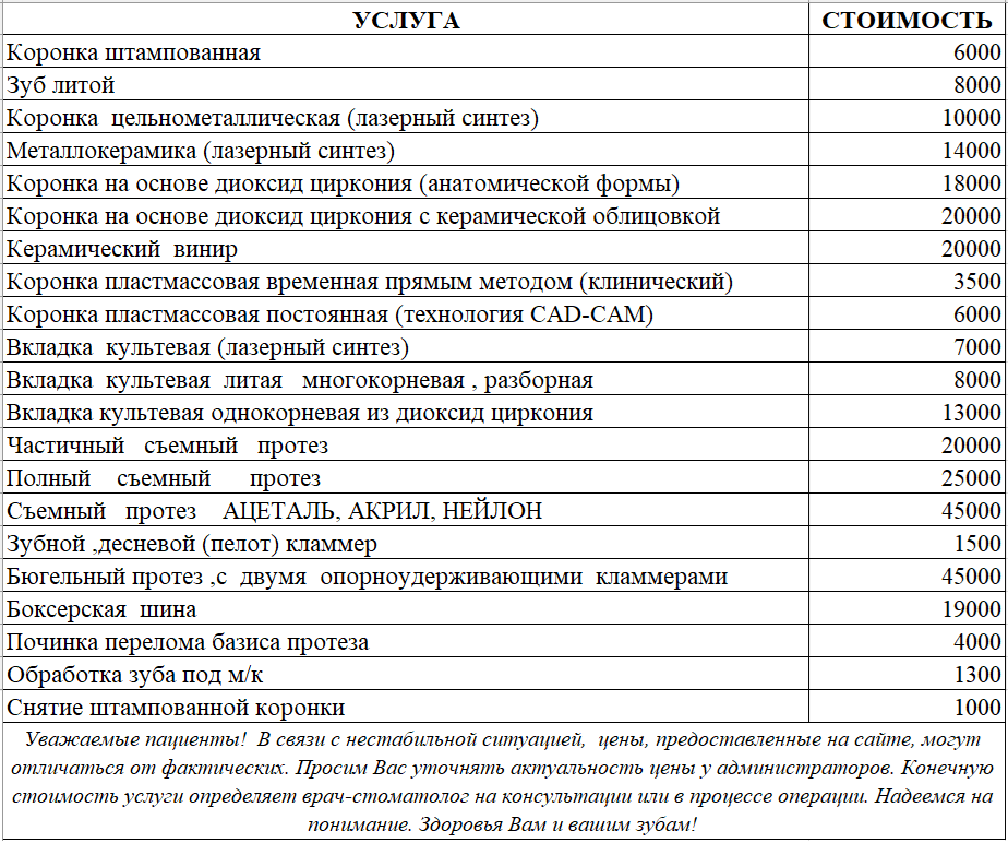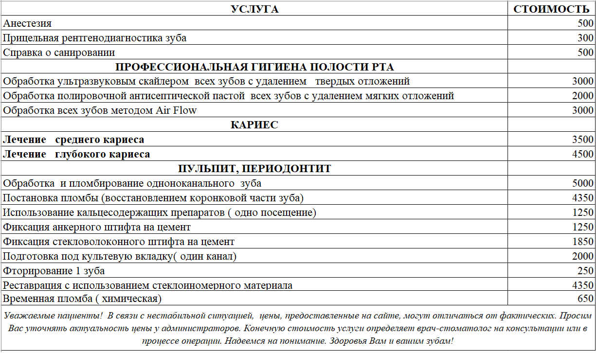 Уважаемые пациенты! В связи с нестабильной ситуацией, цены, предоставленные на сайте, могут отличаться от фактических. Просим Вас уточнять актуальность цены у администраторов. Конечную стоимость услуги определяет врач-стоматолог на консультации или в процессе операции. Надеемся на понимание. Здоровья Вам и Вашим зубам!