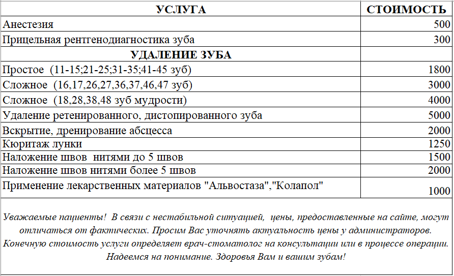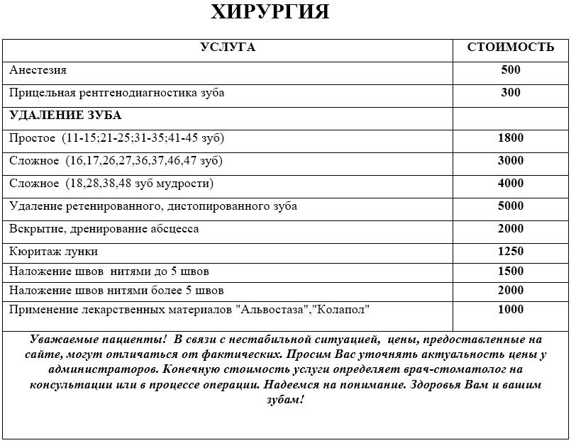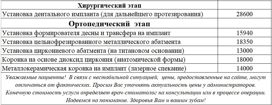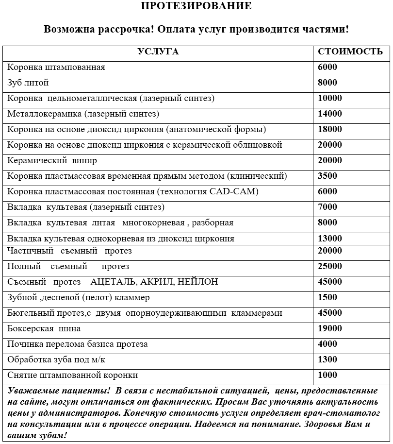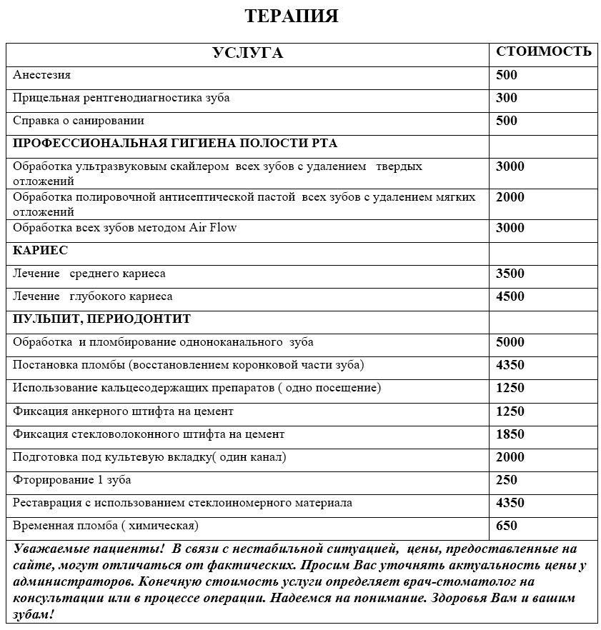 Уважаемые пациенты! В связи с нестабильной ситуацией, цены, предоставленные на сайте, могут отличаться от фактических. Просим Вас уточнять актуальность цены у администраторов. Конечную стоимость услуги определяет врач-стоматолог на консультации или в процессе операции. Надеемся на понимание. Здоровья Вам и Вашим зубам!